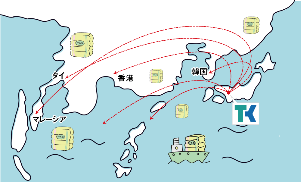 分別した古着は、国内や海外、主に東南アジアの国々に再流通します。相⼿国の実情にそぐわない「寄附」や分別せずに送りつけられる輸出が、現地の環境問題につながっているといったケースもありますが、私たちは「ゴミとなるものを輸出しない」ことをモットーに、各国のバイヤーと密にコミュニケーションを取り、それぞれのニーズや実情に合わせて、最適なものを選択し、届けています。古着にも品質があり、細分化によって価値が⾼まります。⻩⾊い梱包に、髙島産業を表すグリーンの「TAK」マークは、海外市場で安⼼品質の⽬印になっています。