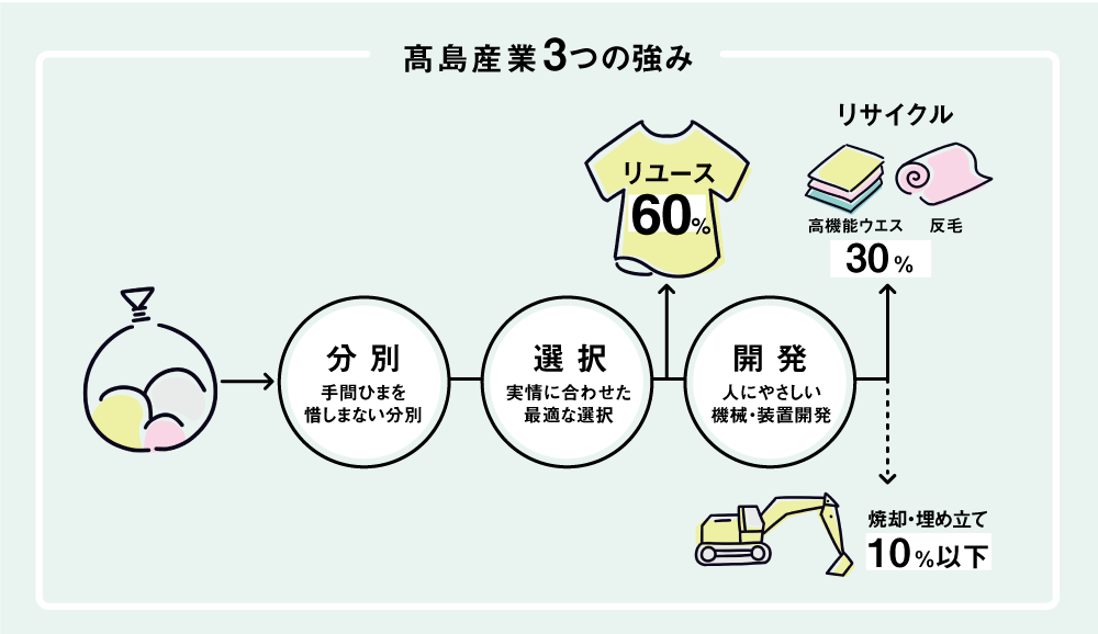 環境省の調査では、家庭から手放される服のうち、リユース・リサイクルされる割合は約34%。残りの7割近くはゴミとして焼却・埋め立て処分されています。髙島産業は、「分別」「選択」「開発」の3つの強みを生かして、廃棄率10%以下を実現。さらに1着でも多くリユース・リサイクルできるよう、努力を重ねています。